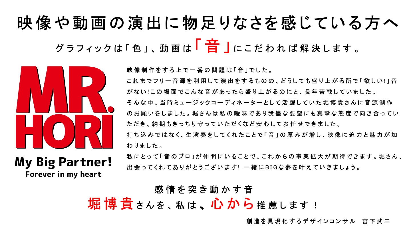 | 6.当社について、どう話を切り出したらよいか? | 作曲家の方へ 「制作お忙しいですか?」 ↓Yes 「本当は生ドラムにしたいけど、納期の都合で諦めることはありませんか?」 ↓Yes 「日本では数少ない宅録に特化したドラマーがいて、時間と手間とお金をあまりかけずにハイクオリティなドラムトラックを得ることができますよ。」 【紹介文】 21年以上のキャリアを持つプロのロックドラマー堀博貴さんをご紹介いたします。 愛知県のご自宅にレコーディングスタジオを構え、全国・海外からの宅録案件にも対応されています。 演奏だけでなく、波形編集まで一貫して対応できる数少ない宅録ドラマーなので、「打ち込みだと物足りないけど、時間も予算もかけられない…」とお悩みの〇〇さんのようなお忙しい作曲家さんの課題解決をされています。 とお繋ぎください。 |