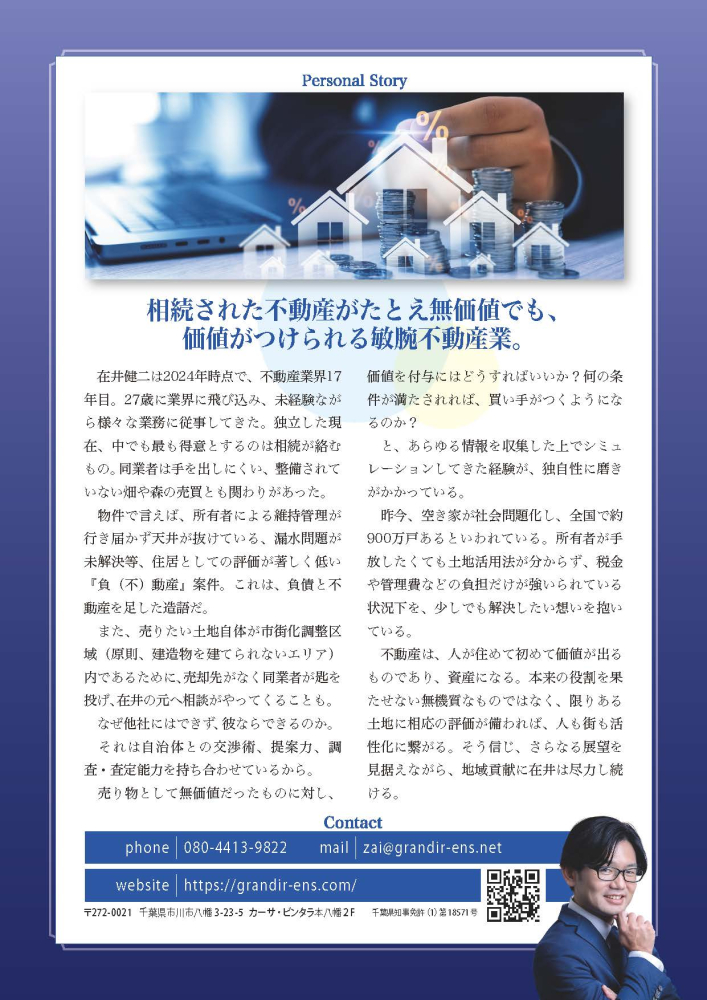 | 1.名前とプライベート情報 | 在井 健二(ざい けんじ) 生年月日:1979年7月27日生まれ 思春期にHIPHOPダンスにはまり、ラジカセ持って踊っていました。 18歳の頃バイク事故を起こし、膝の靱帯がボロボロになり、ダンスとバイクを辞めて 車のスピード狂に、運転好きと車好きを勘違いし、自動車の専門学校に入学 専門学校:旧)ニホン・オートモービル・カレッジ 自動車研究科・現)日本自動車大学校 研究科卒 専門学校は4年制で最初の2年間で ガソリン・ジーゼル2級整備士(国家資格)・中古車査定士・アーク溶接・ガス溶接・有機溶剤取扱主任者、等々取得 残り2年間は、自動車の研究や自動車整備工場の経営等を学ぶ予定でしたが、 カー雑誌【Option】の学生のレース活動を追いかける企画で、 ドライバーとして雑誌主催の耐久レースに2年間参戦。 ほぼその企画のみで学校を卒業しました。(4輪ドリフトだって出来ちゃいます笑) 車関係の資格たくさん保有してますが車業界には1年くらいしか居ませんでした。 OA機器販売を2年半ほど行い 27歳の時に不動産屋に就職 4年間不動産仲介業を学び、 13年戸建て分譲デベロッパーに勤務し独立(内7年間は会社の№2として切り盛りしてました) |