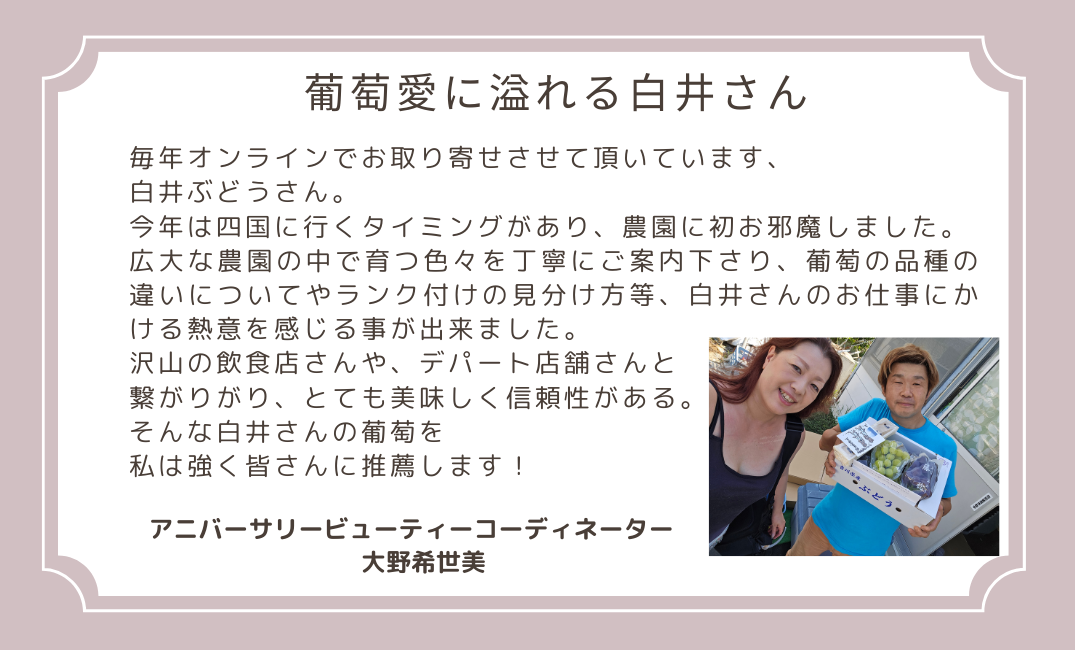 白井さん!!美味しいぶどうと、いつも変わらぬゆったりとした存在でいて下さりありがとうございます。白井さんの葡萄に対する想いと、仕事に向かう姿勢がとてもリンクしていていつも感動しています。また香川に車で行きますね!!