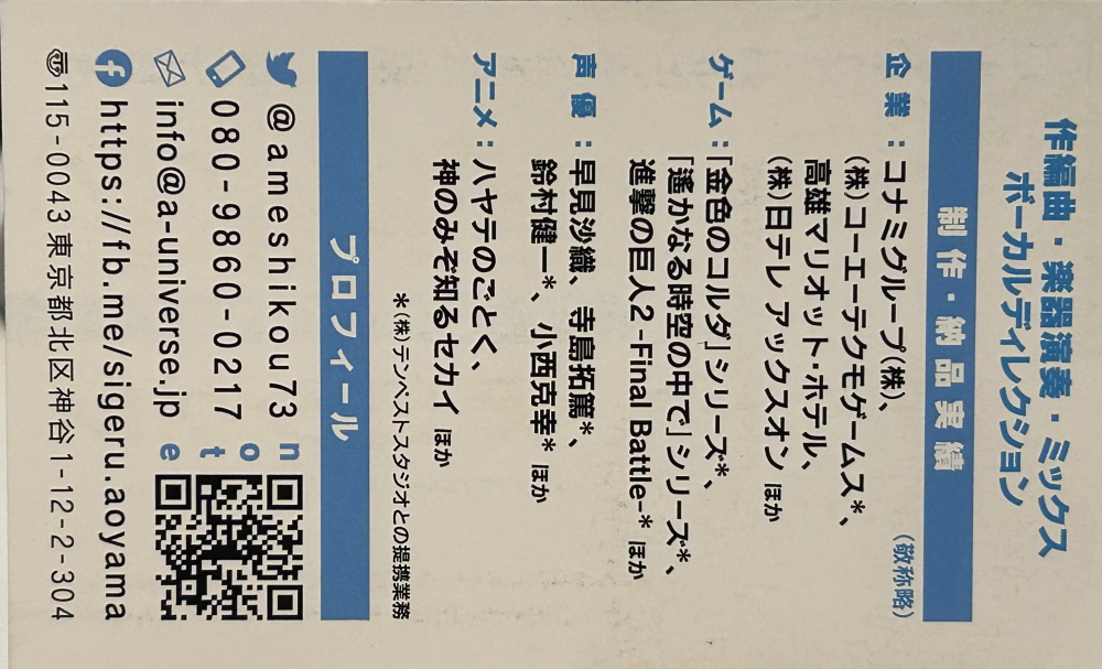 | Accomplishments(実績) | ◆ BGM 制作実績 ・高雄マリオット・ホテル WEB CM 楽曲制作(作編曲) ・(株)日テレアックスオン 映画OP ムービーロゴ制作(作編曲) ・ゲーム「進撃の巨人 - Final Battle-」(コーエーテクモゲームス) 楽器演奏(ギター、マンドリン) ・株式会社コナミグループ「BEMANI 8bit collection」 『Evans -Reiwa 8bit Ver.』(編曲・ミックス) ◆ ゲーム キャラソン 制作実績(作曲、) ・「下天の華」 ・「金色のコルダ スターライトオーケストラ」 「遙かなる時空の中で4」 「遙かなる時空の中で7」 「アンジェリーク」 「WEBコンテンツ Dragon's Bite~龍王ノ宴~」 ◆ 歌唱曲提供実績 鬼滅の柱の声優さん5人に楽曲提供しています。 ・早見沙織 ・鈴村健一 ・寺島拓篤 ・小西克幸 ・関智一 ・森田誠一 ・大空直美 ・山崎はるか ・Nゼロ |