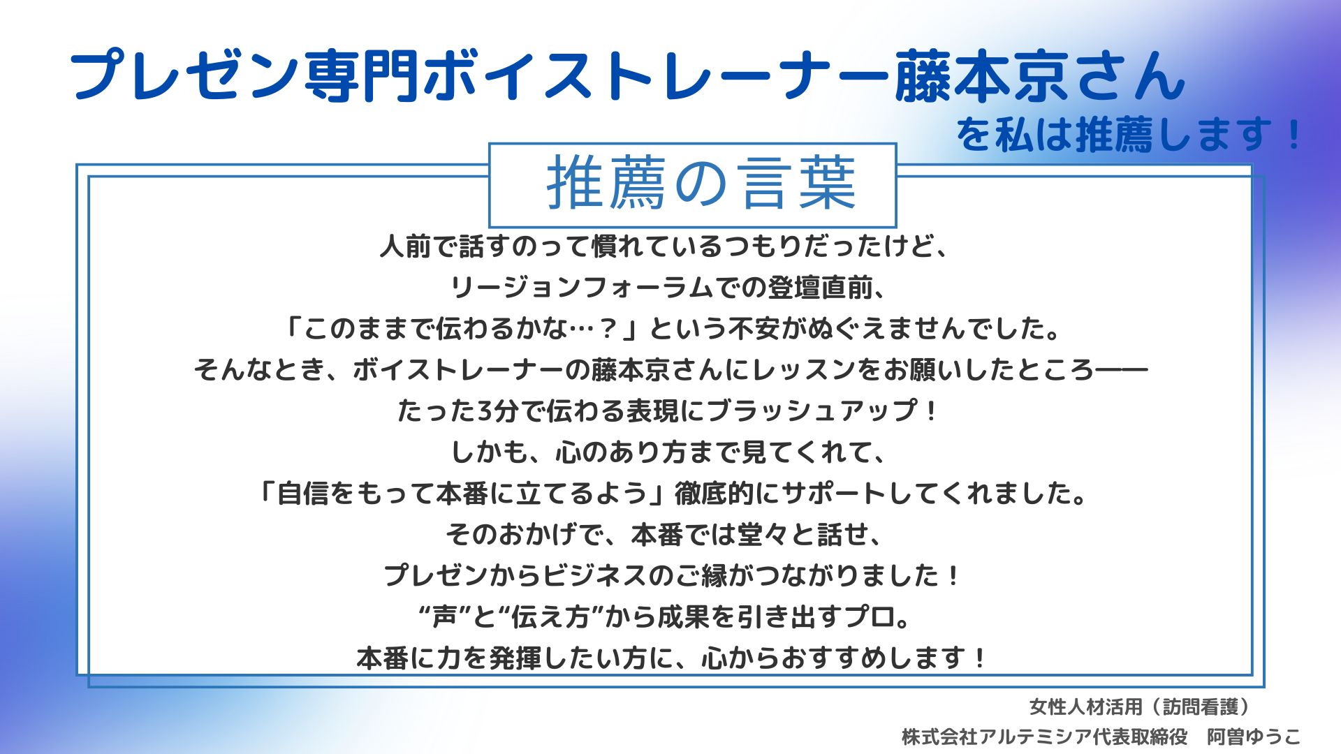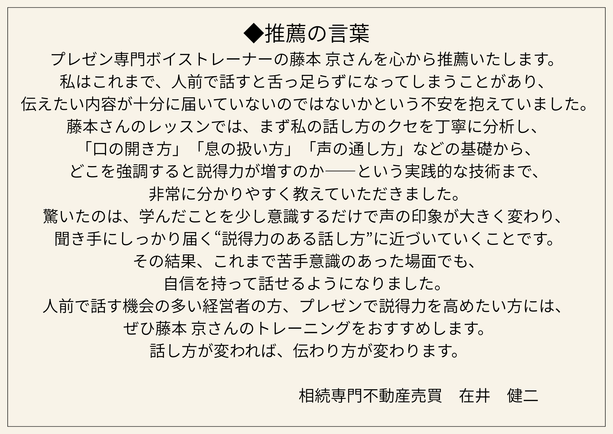 | 専門分野 | 【士業向け】プレゼン専門ボイストレーナー |
