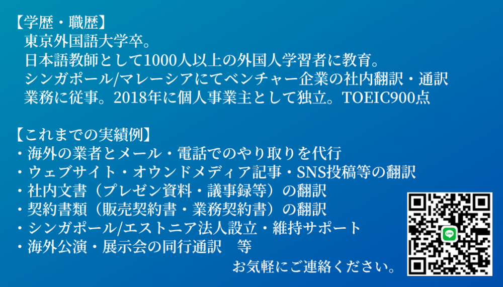 | Accomplishments(実績) | シンガポール/エストニア法人設立・維持サポート 海外の業者とメール・電話でのやり取りを代行 オンライン会議の通訳 社内文書(プレゼン資料・議事録等)の翻訳(英日・日英) 契約書類(販売契約書・業務契約書)の翻訳(英日・日英) ウェブサイト・オウンドメディア記事・SNS投稿等の翻訳(日英) 電子書籍の翻訳(日英) NYカーネギーホール出演の沖縄伝統芸能&和太鼓奏者のチームに同行通訳 Japan Expo Paris2025にて雅楽のチームに同行通訳 インバウンド向けツアーへの同行通訳 |