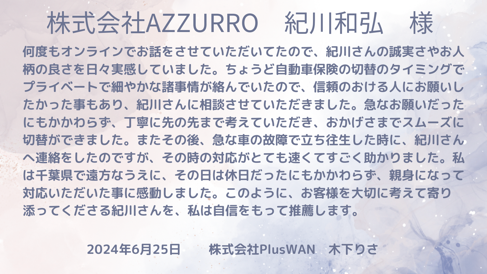 第3期で同じメンバーシップ委員会だった紀川さん。それまで1to1も何度かさせていただいており、損害保険のプロだという事は十分わかっていましたが、リアルでお会いしたり、メンバーシップ委員会でご一緒させたいただいている中で、仕事やBNI活動への向き合い方を見ていて、紀川さんの誠実さやお人柄の良さを日々実感しておりました。ちょうど自分の自動車保険の切替のタイミングだったのですが、プライベートで細やかな諸事情が絡んでいたので、信頼のおける人にお願いしたかった事もあり、紀川さんに相談させていただきました。急なお願いだったのにもかかわらず、丁寧に先の先まで考えていただき、おかげさまでスムーズに切替ができました。本当に助かりました。紀川さんありがとうございました。
