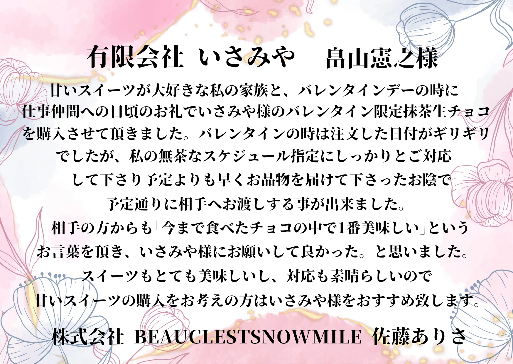畠山さん いつもありがとうございます 畠山さんのお菓子を取引先に贈るギフトとして利用させて頂いておりますが 皆さんとても美味しいと喜んでくれているので私もとても嬉しい気持ちになります BCP担当としてメンバーのことをいつも心配して頂きありがとうございます お店が忙しい中、都内のイベントに参加する姿勢はとても見本になります また対面でお話しできるのを楽しみにしております。