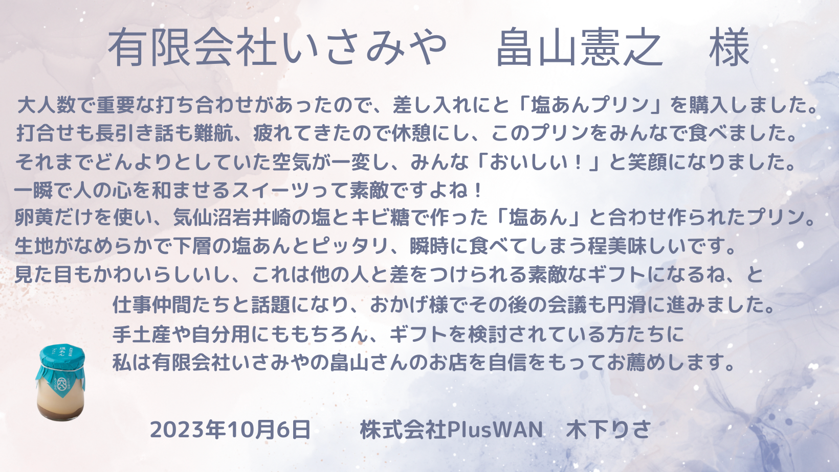 いつもありがとうございます。 のりさんのBCP発信、うっかり忘れてしまいがちな防災への意識を、定期的に思い出させていただいております。いつ来るか、わからないですからね。 さて、先日対面イベントの時に頂いた塩あんプリンの味が忘れられません。 おかげで、ご近所さんから時々頂く他店の塩プリンのおいしさがかすんでしまったような気がしてきてしまい、困っております。(笑) また食べたいです。 引き続きよろしくお願いいたします!