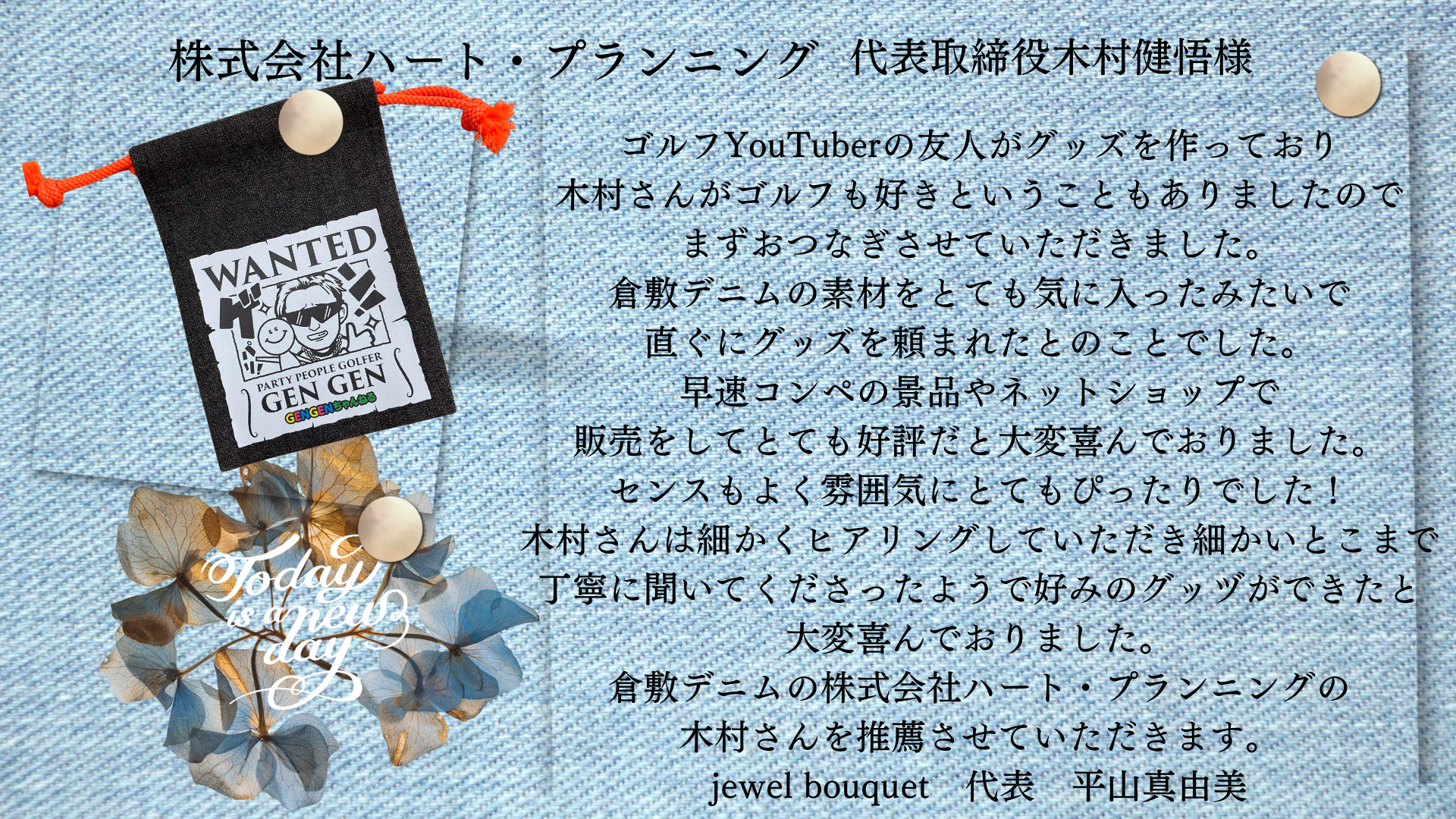木村さんへ いつもデニムビールを送っていただき、本当にありがとうございます。デニムビールは、岡山に住んでいる既存のお客様はもちろん、観光で訪れた方々にも大変喜ばれています。ビールが持つポテンシャルで、お客様同士の会話を生み出し、BARのコミュニティー空間をより豊かなものにしています。 本当にありがとうございます。