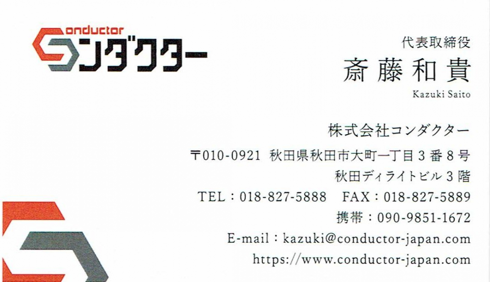 | 2.会社名・役職 | 株式会社コンダクター 代表取締役 斎藤 和貴 〒010-0921 秋田県秋田市大町一丁目3-8秋田ディライトビル2階 |