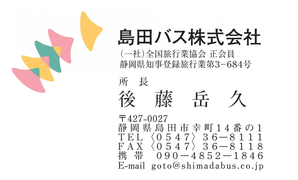 | 2.会社名・役職 | 島田バス株式会社(全国旅行業協会正会員 静岡県知事登録旅行業 第3-684号) 役職:所長 社名にバスと入っていますが現在はバス会社ではなく旅行会社です。 以前はバス会社でした… |
