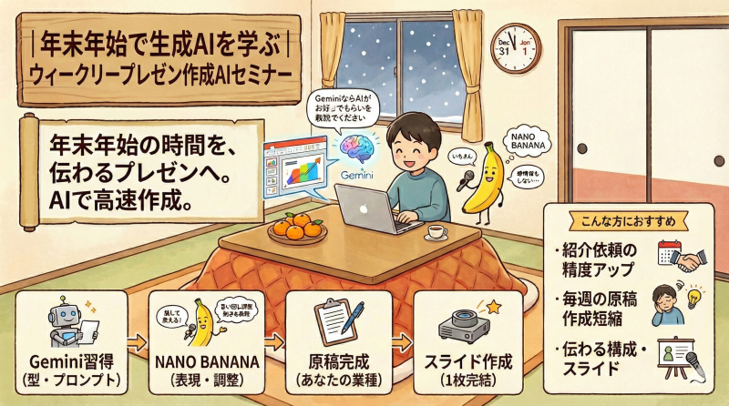 年末年始の“まとまった時間”を、今年の振り返りと来年の紹介獲得につながる準備に変える。生成AIで、ウィークリープレゼンを「迷わず・早く・伝わる形」で仕上げます。