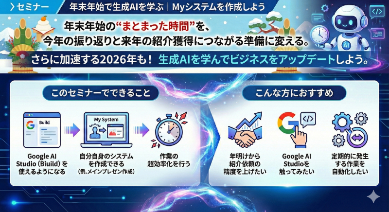 年末年始の“まとまった時間”を、今年の振り返りと来年の紹介獲得につながる準備に変える。生成AIで、自分自身のシステムを作って、作業の超効率化を行う