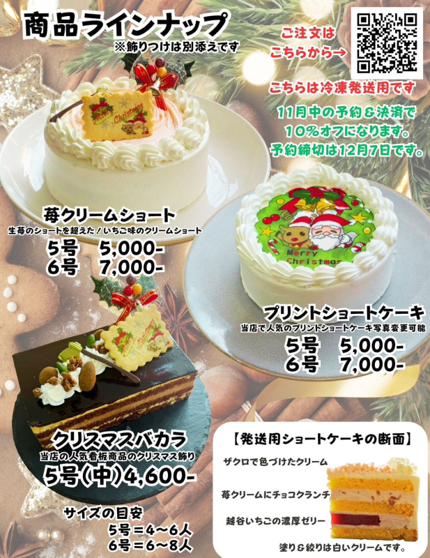 冷凍でも美味しい当店のケーキで楽しいクリスマスをお過ごしください。