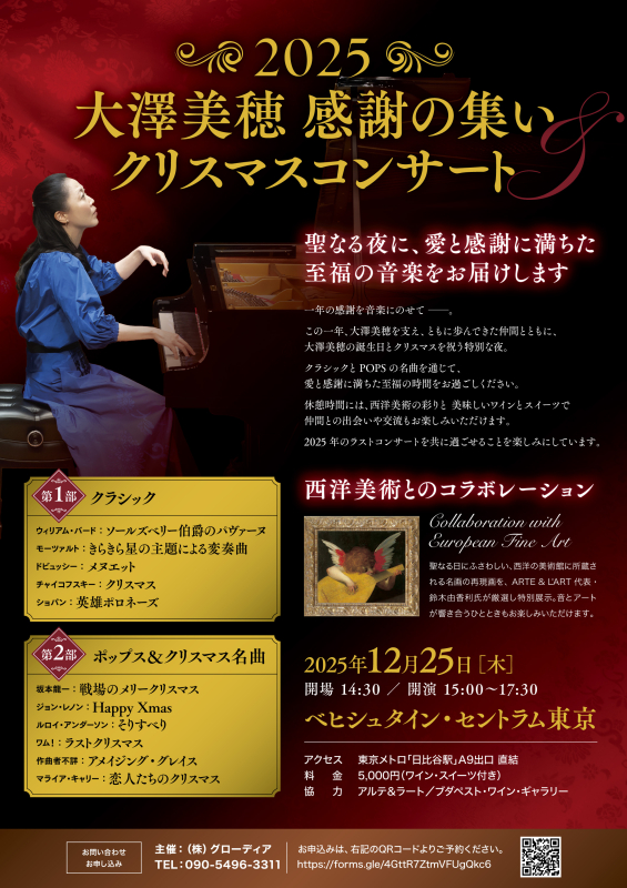 前半はクラシック、後半はクリスマスの名曲をお聴きいただきます。鈴木由香利さんによるインテリアアートを数点展示し、休憩時間には、美味しいハンガリーワインとカヌレをご用意して、皆様をお待ちしております。