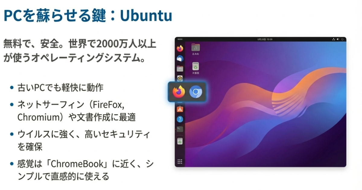 Windows 11を入れることができず、使い道がなくなった古いパソコンをインターネット閲覧ソフトでGoogle Chromeと同じ感覚でインターネット検索が出来るパソコンを作るワークショップとなります。