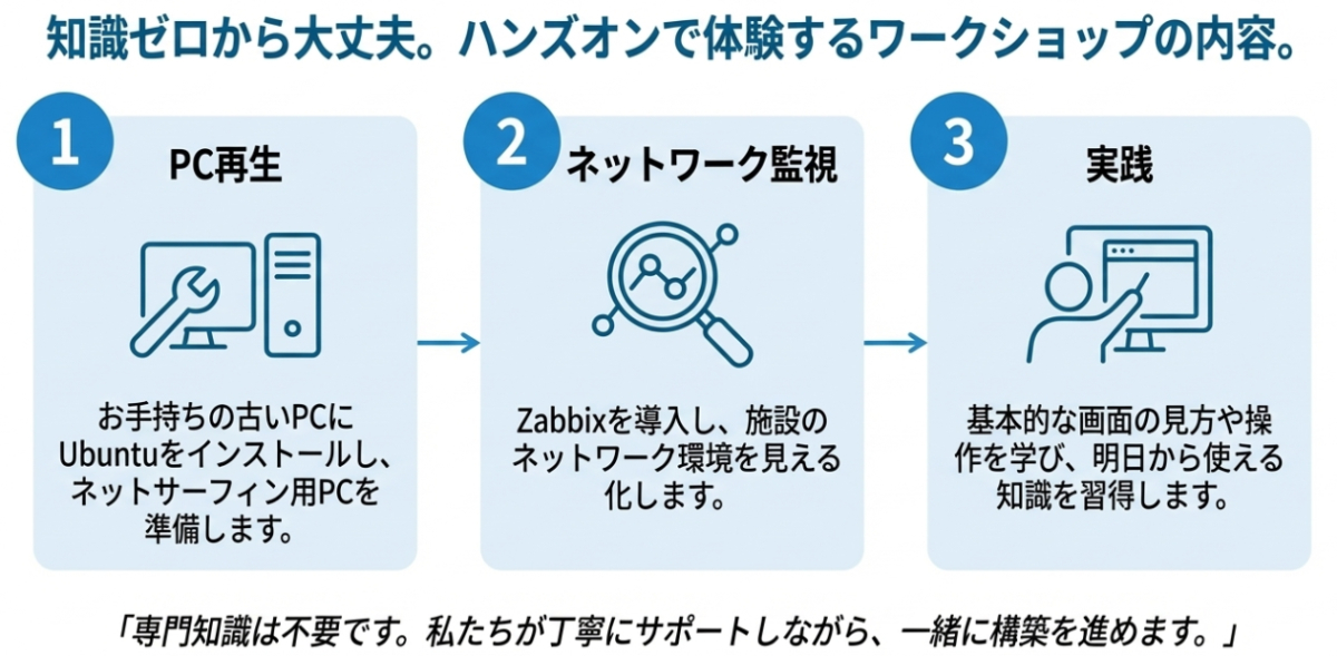 Windows 11を入れることができず、使い道がなくなった古いパソコンをLINUXという形で再生し、子供たちのインターネット利用や施設のネットワーク監視ツール環境構築の為のワークショップとなります。