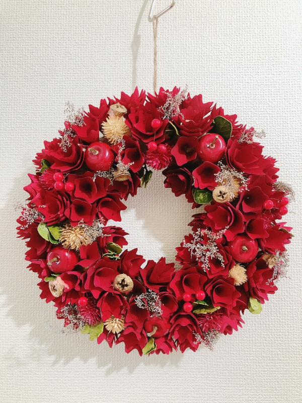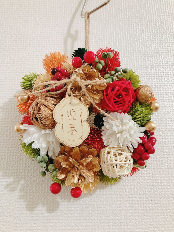 迎春プレートを外せば、お正月を過ぎてもドライフラワーリースとして飾っていられます。